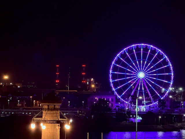 The crown jewel of our short visit was Wały Chrobrego (VAH-wi HROH-breh-go), Szczecin’s riverfront promenade. Imagine grand staircases, stately buildings, and views over the Oder River dotted with shipyard cranes. We walked it after dinner in the rain — cloudy, chilly, dark, and somehow perfect. Not a “bucket list” landmark, but absolutely one of those places that feels worth the detour.
