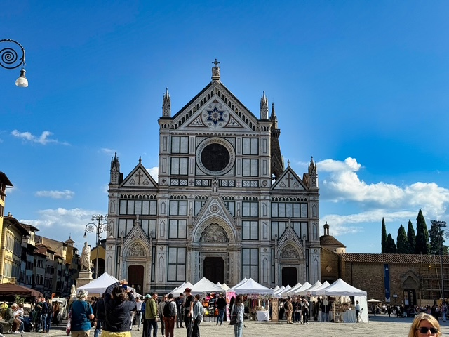 We wrapped up our sightseeing at Basilica di Santa Croce, a masterpiece in its own right. Its marble façade gleams in soft shades of white, green, and pink — elegant, symmetrical, and full of quiet grandeur. Standing in the square, it’s hard not to feel a little awestruck knowing that legends like Michelangelo and Galileo are buried just inside.
