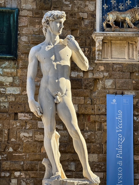 From there, we wandered through Piazza della Signoria, Florence’s open-air museum, surrounded by grand statues and the imposing Palazzo Vecchio. Out front stands the replica of Michelangelo’s David, which honestly scratches the itch if your family (like mine) is feeling a bit “galleried out.” We skipped the Galleria dell’Accademia this time — saving the original David for a future trip when enthusiasm levels are a little higher.