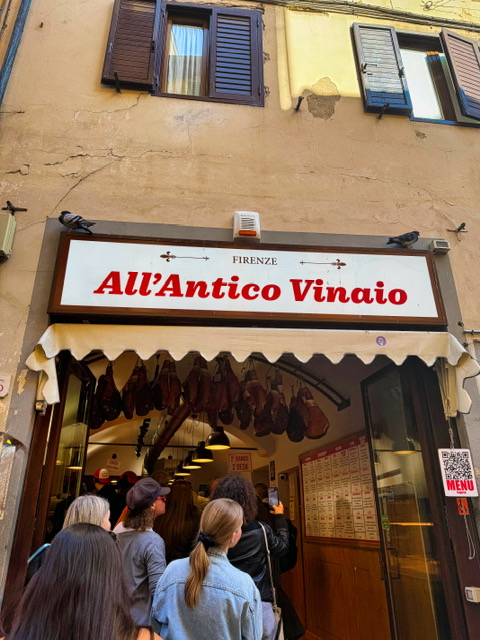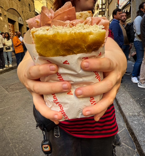 We kicked things off at All’Antico Vinaio, home to the most famous sandwiches in Florence — and yes, they’re every bit as good as the internet promised. We first heard about it on YouTube, where travelers couldn’t stop raving about the pillowy schiacciata (pronounced – skya-CHAH-tah) bread stuffed with salty prosciutto, truffle cream, and just the right amount of cheese.