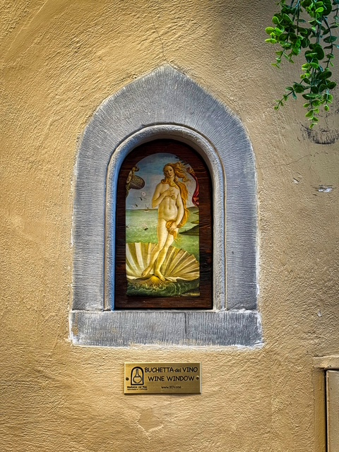 Our final mission of the day was to track down some of Florence’s famous wine windows — buchette del vino. These tiny arched openings, built right into the walls of old palazzi, have been part of Florentine life since the 1600s. Back then, wealthy families with vineyards used them to sell wine directly from their homes, and during plague times, they became an ingenious “contactless” delivery system — centuries before the word even existed.