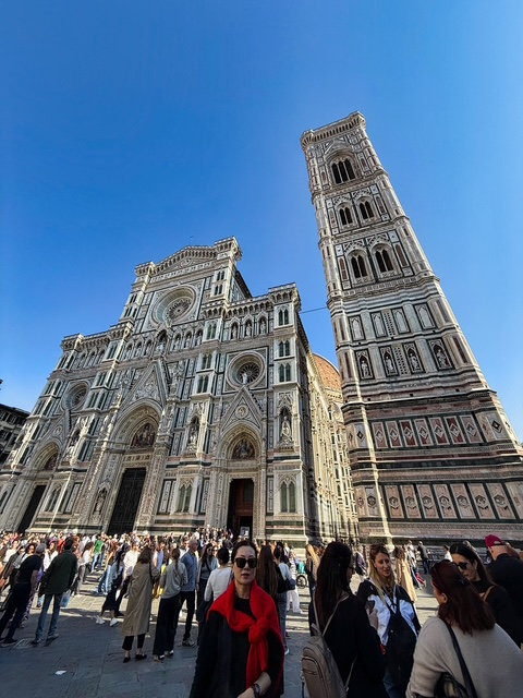 The Florence Cathedral — Cattedrale di Santa Maria del Fiore — is one of those places that completely stops you in your tracks. It’s massive. Like, you think you’re ready for it… and then you turn the corner and your jaw just drops. The size, the detail, the colors — it’s unreal. The entire façade is covered in pink, white, and green marble, with intricate carvings and statues everywhere you look. It’s the kind of building that makes you wonder how on earth they managed to pull this off hundreds of years ago.