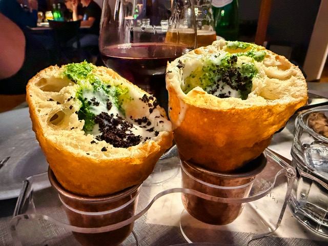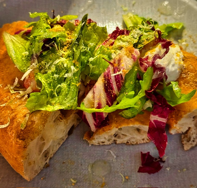 This was not a heavy calzone—it’s folded, but feather-light. The escarole brings a gentle bitterness, balanced with warmth, a hint of salt, maybe a whisper of cheese. It’s earthy, elegant, and unlike any “calzone” we’ve ever had. By this point in the tasting menu, we were absolutely stuffed and could only manage a few bites—but those bites were unforgettable.