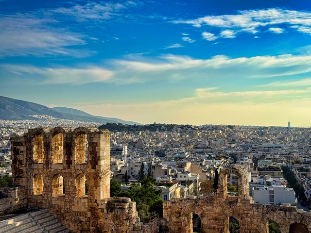 Once you reach the top, you’re rewarded with panoramic views of Athens stretching endlessly in every direction. White buildings, rolling hills, distant mountains, and the city humming far below—it’s the kind of view that makes you stop mid-sentence and just stare.