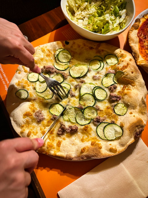 Throughout our travels in Tuscany and Umbria, we only had pizza a few times, but every single time it surprised us. The taste and texture felt shockingly familiar—thin, foldable, and beautifully crisp around the edges. It had serious New York energy.
