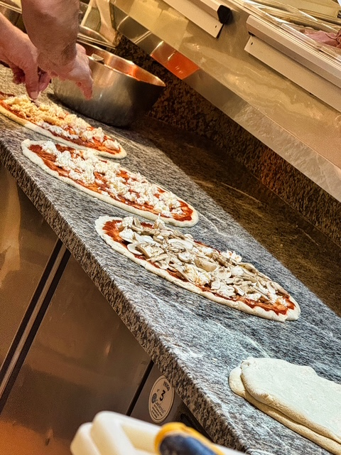 We learned that their dough fermentation process lasts about 48 hours to four days, giving the crust its light texture and complex flavor. They use local flour blends, fresh yeast, and a room-temperature natural fermentation to develop depth without heaviness. When it’s time to bake, the pizzaiolos dust the counter with semolina flour, used exclusively for stretching the dough—giving the base that signature slightly gritty texture and subtle crunch. The pizzas are baked at a slightly lower temperature than Neapolitan style, creating that perfect golden, blistered crust that’s both crisp and tender.